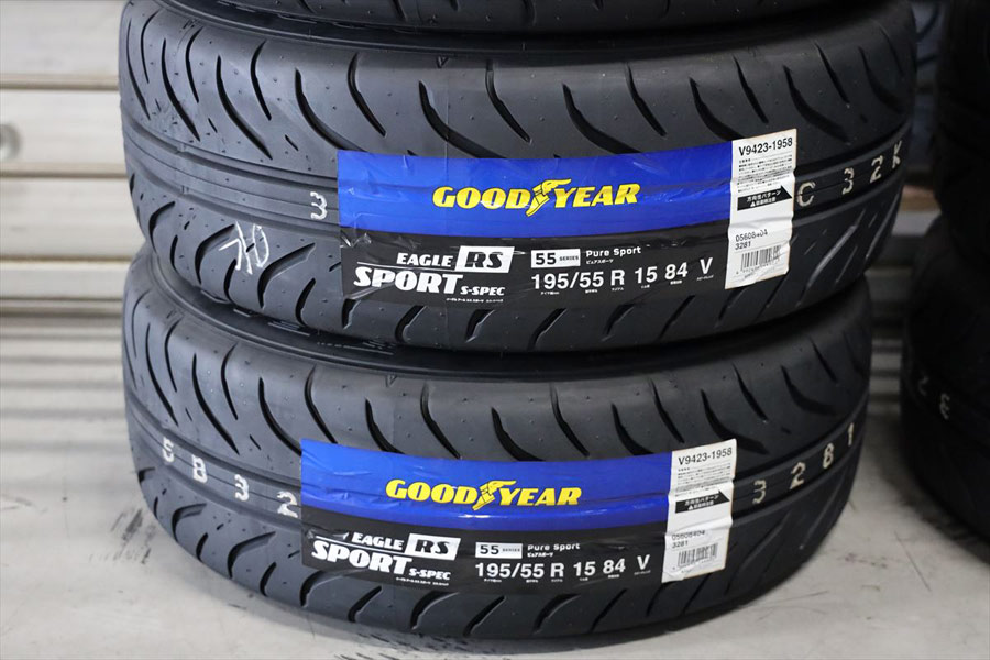 「Yaris Cup」の指定タイヤは、タイヤサイズは「195/55R15」、銘柄はグッドイヤー「EAGLE RS SPORT S-SPEC」が指定されています