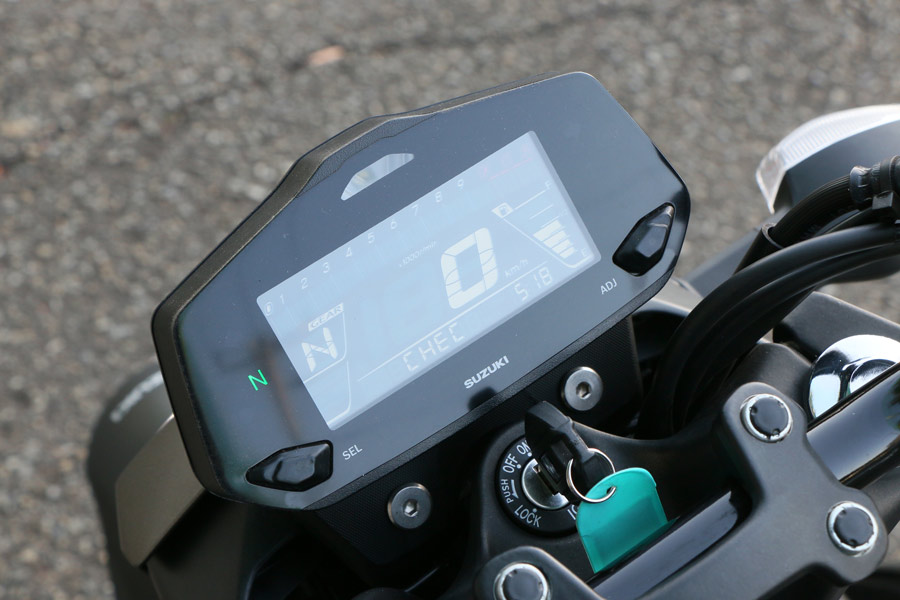 コンパクトなデジタルタイプのメーターには、速度の上にバータイプのタコメーターが表示。シフトインジケーターも装備されている
