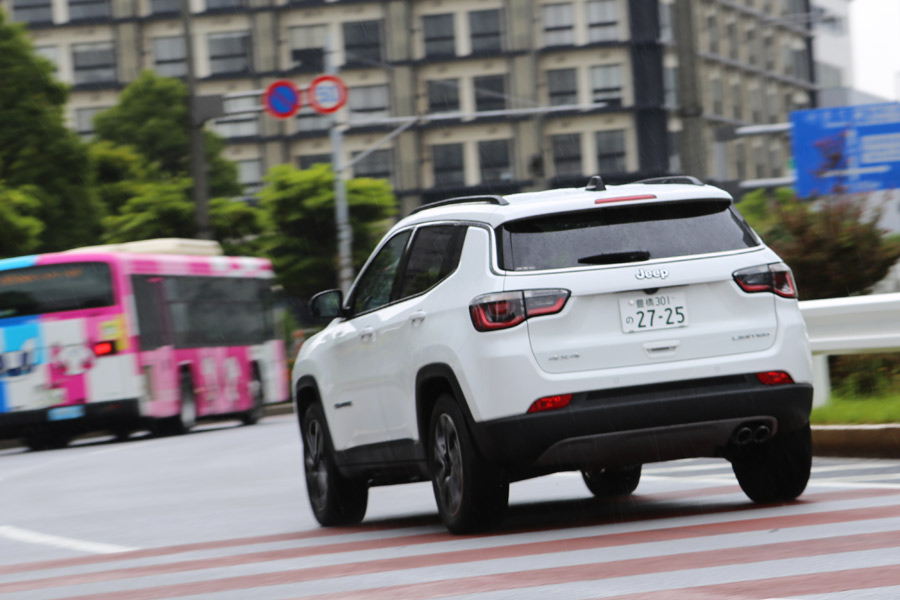 スタート、ストップボタンを押してエンジンをスタートさせ、剛性のあるセレクトレバーでDレンジを選ぶ。そして、アクセルを軽く踏み込むと、軽快にコンパスは走り始めた。市街地を走っていると、4WDのトルク配分は自動で変更され、それによる違和感もない。交差点で、フルロックに近いくらいステアリングを切ってみてもブレーキング現象などはなく、普通の乗用車と同じように扱うことができる。