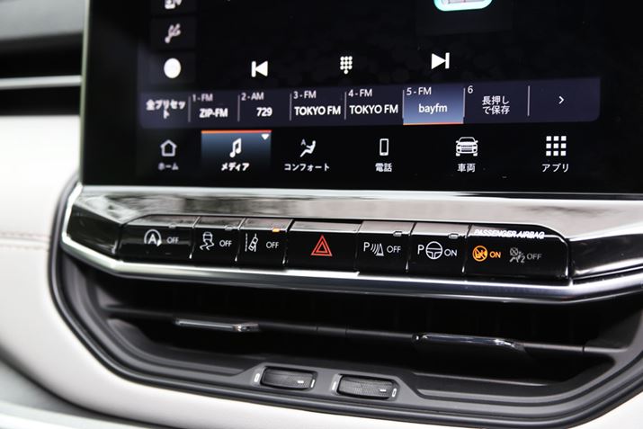 煩雑でわかりづらいセンターディスプレイ下のスイッチ類(上画像)と、使用頻度が高いにもかかわらず、下方に設置されているオーディオ、エアコン関連スイッチ(下画像)