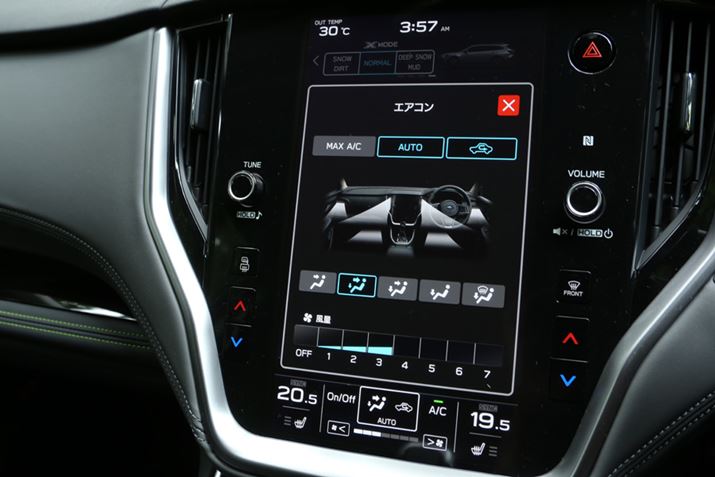 新型「レガシィアウトバック」に搭載されている、「11.6インチ センターインフォメーションディスプレイ」。先代では、「X-MODE」の設定はスイッチ操作で行っていたが、新型ではセンターインフォメーションディスプレイ上から設定することができるようになった