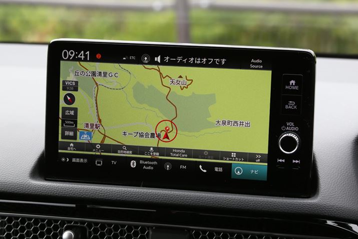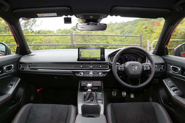 車内に入ると、個性的なインパネが目に映る。横長に配置された網目デザインのパネル装飾のなかに、エアコンの吹き出し口が内蔵されているなど、インパネは凝った作りになっている。ミドルサイズのクルマに多く採用されているやわらかなパッドなどは、新型シビックにはあまり使われていないが、光沢のあるブラックパネルが装着されていることなどによって、内装の質感は同クラスのクルマの平均水準のものとなっている。