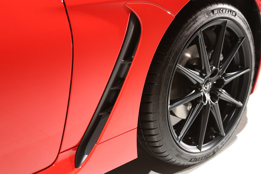 新型「GR86」「BRZ」へ新たに設けられた「エアアウトレット」。ホイール周辺に発生する乱気流を抑えることによって、操縦安定性を向上させている