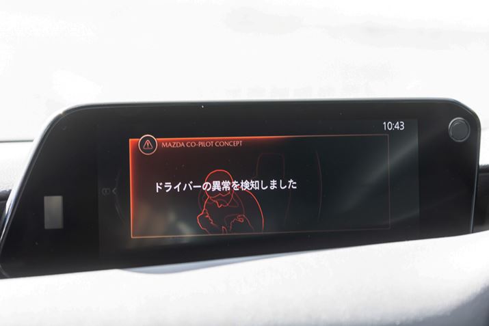 すでに量産車へ搭載されている、マツダの先進運転支援システム「i-ACTIVSENSE」でも、センターディスプレイ内のドライバーモニタリング用カメラを用いることで、ドライバーの顔や眼の動きから、眠気を感じていたり脇見をした状態と判断されると、インパネへ注意喚起が表示されるようになっている。