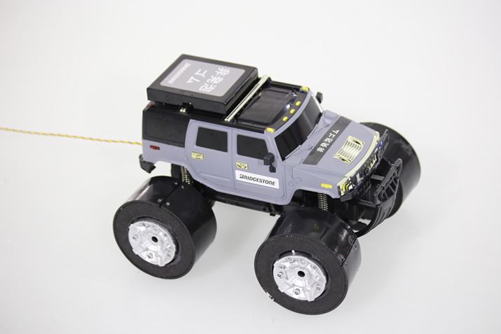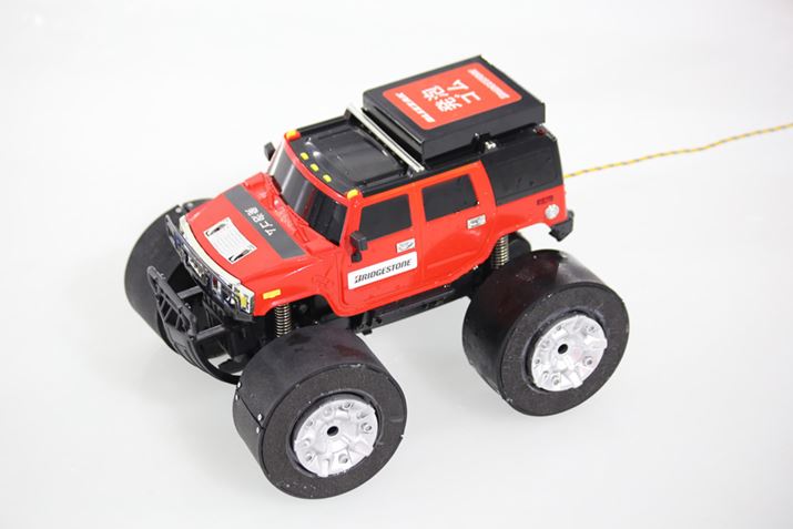これは、ラジコンを使ったテストでも同様だった。発泡ゴムを4輪に巻いたものと、もうひとつは非発泡ゴム、いわゆる板ゴムを4輪に巻きつけてある。この2台を綱引きして、どちらが前に進むかをやってみたのだが、明らかに発泡ゴムのほうが引っ張るし、発泡ゴムのスロットルを開けないで非発泡ゴムのみ開けると、スリップして動かない。次に、それぞれのゴムの上に水をかけ、氷の上ではほぼミューがないような状態でも試してみたのだが、より顕著にその差が表れた。発泡ゴムも、最初はスリップするがその後じわじわと動き出すのだ。つまり、氷の上を除水して水がなくなってグリップが出てきたということだ。