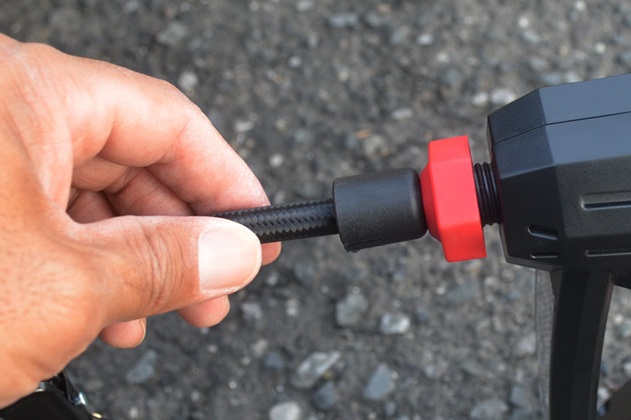 ここから赤いキャップを時計回りで締めます。ゆるいと空気が漏れますが、樹脂製なので強く締めすぎないようにご注意ください
