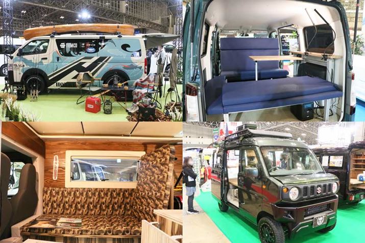 普段の運転しやすさまで考えると、コンパクトなモサイズの「バンコン」(バンをベースとしたキャンピングカー)は有力な選択肢。前出の軽キャンパー同様に、このカテゴリーも以前よりバリエーションが増えているようで、商用車然としたルックスをアウトドアテイストにカスタマイズしたり、限られた車内スペースを拡大できる機構を備えるなど、ユニークなモデルが目立った。
