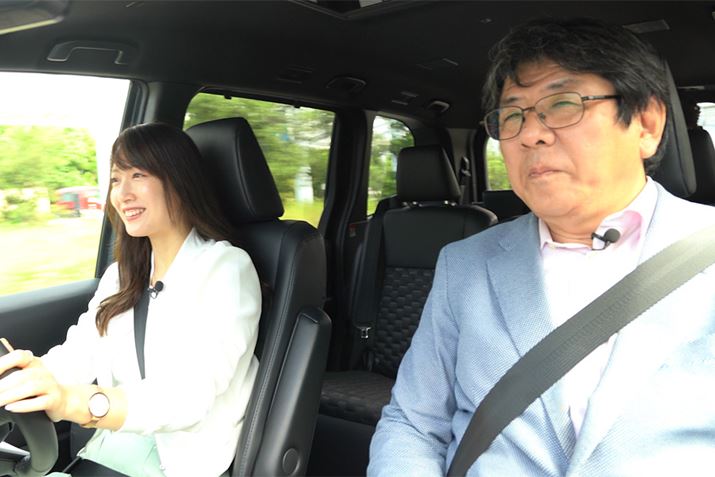 深山さんの試乗感想「新型ノアには初めて乗ったのですが、視界がとてもいいですね! 死角が少ないので、運転していて安心感があります。あと、ガソリン車でも加速は滑らかで、とてもスムーズでした」