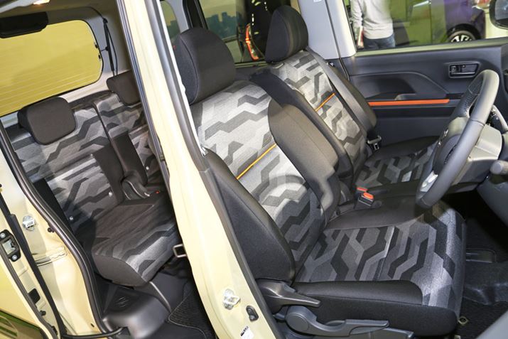 また、インテリアで注目したいのが、カモフラージュ柄のフロントシートとリアシートだ。タントファンクロスのシートは、柄が異なるだけでなく、シート表皮に撥水加工のフルファブリックが用いられている。