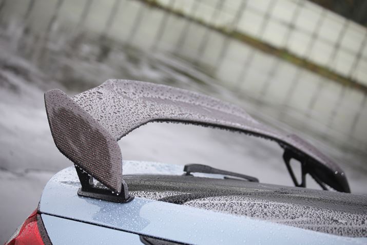 そこで注目したいのが、ホンダアクセスが開発したカーボン製の専用テールゲートスポイラーだ。同製品がユニークなのは、翼状のスポイラーの裏側が空力を考慮して鋸歯状になっていることだ。この空力デバイスは、航空機にも使われている技術で、ボディを下側へと押し付ける力を発生させる。コーナーを曲がるときも、車両の動きに追従する効果があるから、直進時以外にもボディを下側へ押し付ける効果を得られるというメリットがある。さらに、このテールゲートスポイラーには側面のサイドプレートも備わっており、直進安定性を高める効果も発揮する。