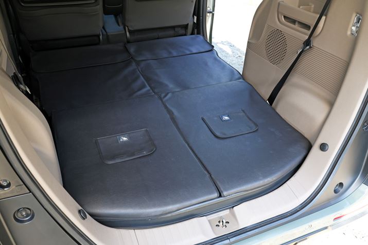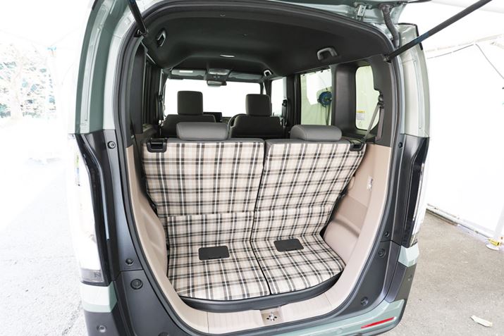 「N-BOX Joy」の荷室を倒して座れば、まるでチェック柄のカーペットを敷いた自宅の床に座っているような、リラックスした気分を味わえる
