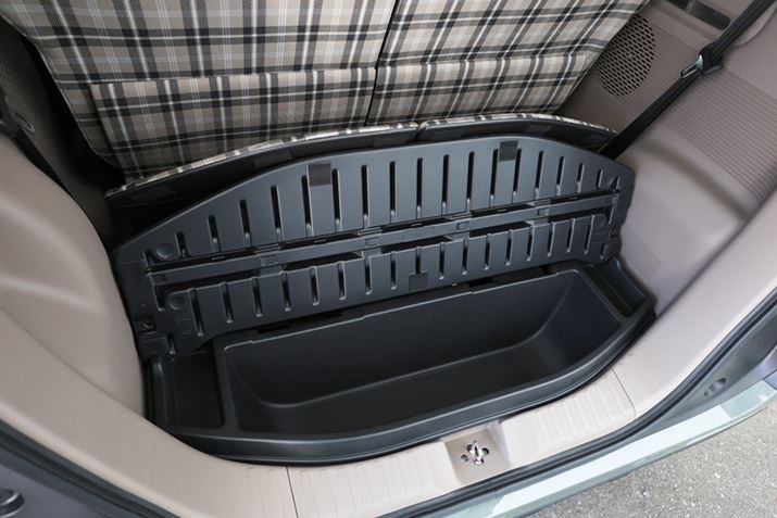 「N-BOX Joy」は、荷室の床を水平に近づけるために、荷室床面の後方が80mm持ち上げられている。荷物の積みやすさを重視すると、荷室の床は低いほうが使いやすいのだが、小部屋としてリラックスして過ごすには水平のほうが望ましいだろう。