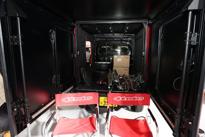 コンセプトモデルでは、荷室の外側のボディがロの字型で、それを引き出すことで空間を拡大していた。だが「ハイゼット トラック ジャンボ EXTEND2」では、コの字型にされていることで、引き出したときに床面がなくなっている。引き出した空間にカーテンをつけることで、選手が中で着替えができたりデッキチェアを置いてミーティングができたりするなど使い勝手がより向上している。