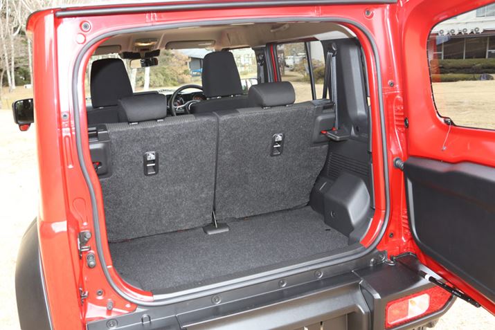 後席を使った場合、「ジムニーシエラ」は荷室面積が狭いが、「ジムニーノマド」なら5ドアハッチバックのような広さとして使える。ただし、後席の背もたれを倒すと、広げた荷室の床に傾斜ができてしまう。ミニバンなどと違って、荷室の床が平らにはならないことには注意したい。