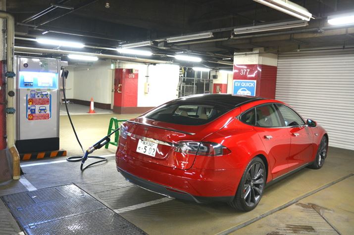 茨城から戻ってきても、まだ走行可能距離は200km以上ある。そのため、この日は、充電設備のない駐車場にモデルSを停めることとした。次にクルマを出す際には、CHAdeMO(チャデモ)方式の急速充電設備が用意された有料駐車場に立ち寄り、充電を実施。時間の都合で、約20分という中途半端な充電時間となってしまったが、走行可能距離を40kmほどプラスできた。その後、数日は遠出の予定もないため、充電なしでこまごまと乗り回した。