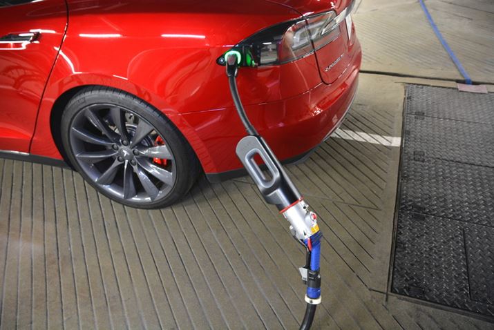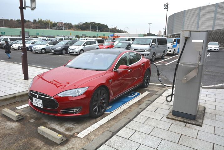 テスラが用意する世界最速の充電スタンド、スーパーチャージャー。モデルSなら数十分で満充電になるという
