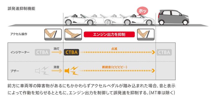 CVT車には、アクセルとブレーキの踏み間違いなどの際に音と表示で警告するとともに、エンジン出力を制御する誤発進抑制機能を装備
