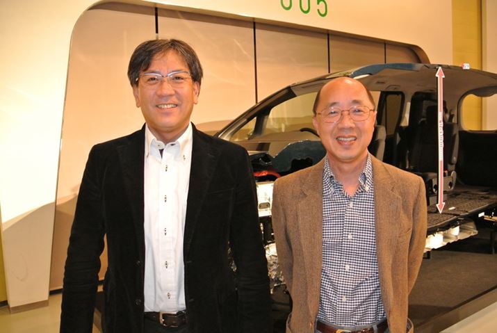 写真左が、トヨタ自動車 製品企画本部 ZH チーフエンジニアの水澗英紀氏。先代モデルを含め、「ノア」「ヴォクシー」に9年間携わる。現在は「エスティマ」や「ウイッシュ」などのミニバン系全体を担当。企画本部の前は、実験部門でエンジンマウントやゴムブッシュ、燃料タンクなどの開発を長年担当してきた。写真右が、製品企画本部 ZH 主幹の川口靖氏。2010年から「ノア」「ヴォクシー」担当になり、今回はデザインと燃費開発を担当。以前は、ウェルキャブの製品企画に9年ほど携わっていた