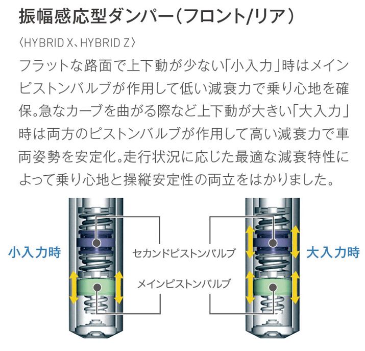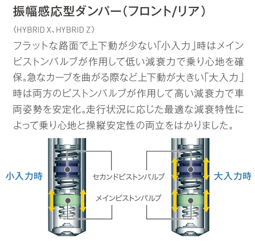 振幅感応型ダンパーはメインとセカンドのふたつのピストンバルブが入力に応じて減衰力を使い分け、乗り心地と操縦安定性を高いレベルで両立させている