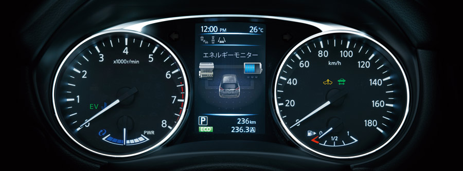 タコメーターとスピードメーターの間にあるファインビジョンメーターは、ハイブリッドシステムの状態など、各種の情報がわかりやすく表示される