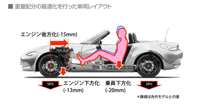 FRレイアウト、フロントミッドシップ、PPFで結合する動力源とデフ、前後重量配分50:50などロードスターの基本レイアウトは踏襲される