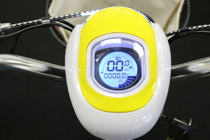 ハンドルの中央にライトと一体となったメーターを装備。速度や走行距離などのほか、バッテリー残量も表示される