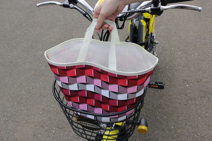 フロントのカゴにはバックがセットされている。バックを外して入店して買い物し、またカゴに収納という使い方ができるのがうれしい