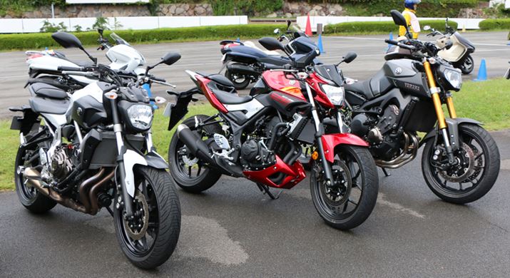 3台並んだ「MTシリーズ」。真ん中にあるのが「MT-25」で左端が排気量700ccの「MT-07」、右端が850ccの「MT-09」だが、存在感は大排気量モデルに引けをとっていない