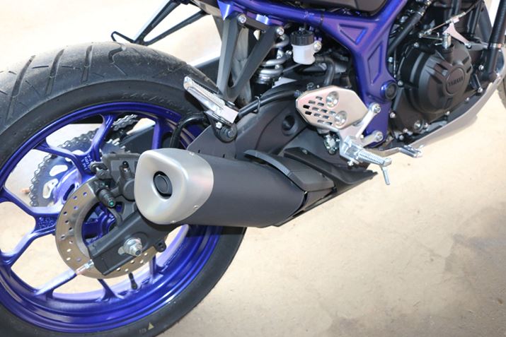 マフラーは「MTシリーズ」共通のショートタイプ。サイレンサー(消音器)は短いがよく消音されており、排気音をうるさく感じることはない