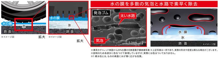 ブリヂストンの保有する技術によって、ゴムに細かな気泡が作られおり、すべりの原因である氷表面の水分を効果的に吸い取ることができる