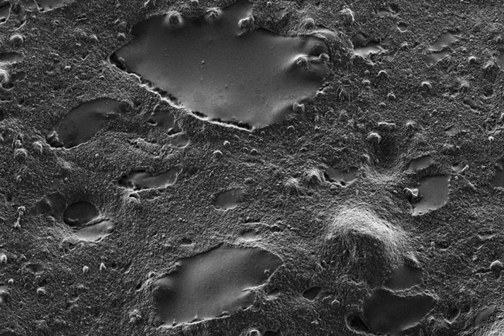 これらの穴は、ゴムに混ぜ込まれた細かなカラである新マイクロ吸水バルーンが形成したもの