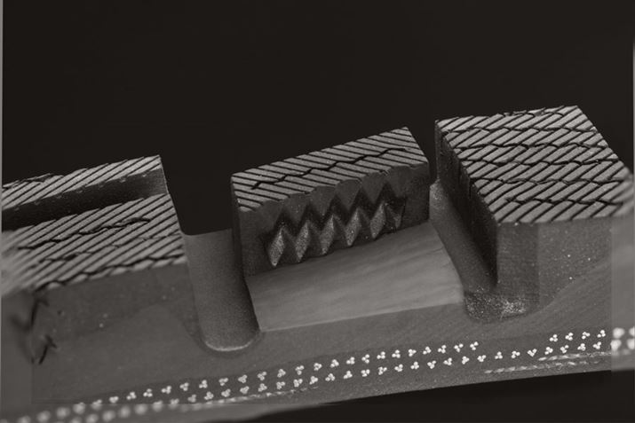 複雑な立体サイプが互いに支え合う「トリプルピラミッドサイプ」構造。剛性を確保することで、接地性や操縦安定性を高めている