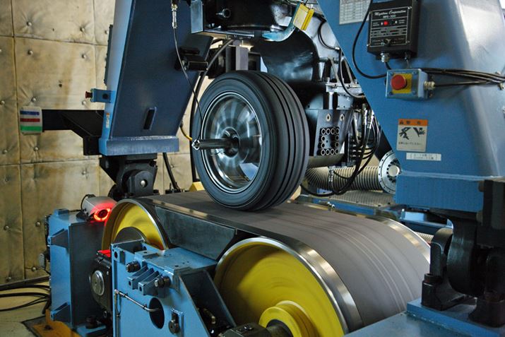 延々とタイヤにドラムを押し付け続ける耐久試験機。最高時速450kmまでテストが可能