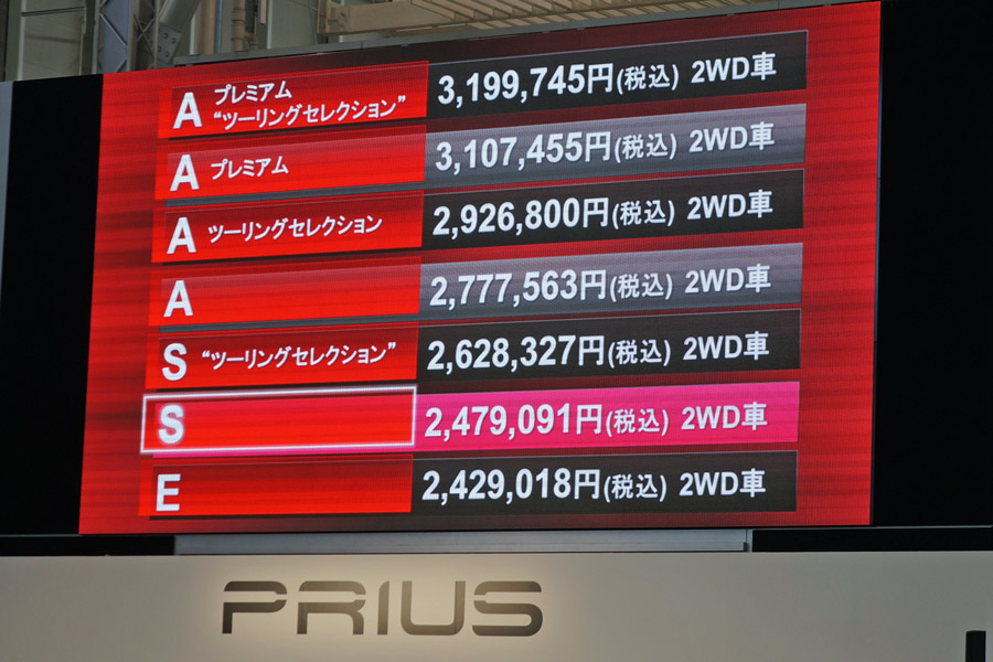新しいプリウスは、上位のAグレード、売れ線のSグレード、燃費に特化したEグレードという3ラインが基本。気になる価格は、Eグレードのメーカー希望小売価格が2,429,018円〜、Sグレード(2WD)が2,479,091円〜、Aグレード(2WD)が2,777,563円〜となっている。先代となる3代目モデルのEグレードが価格205万円からだったことと比較すると、やや値上がりしている印象だ。