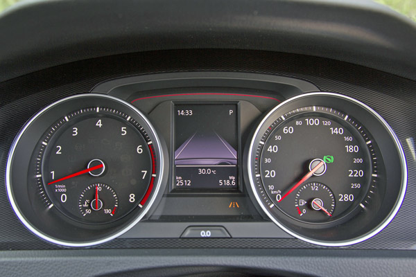 ゴルフ GTIは針など部分部分に赤のアクセントが入る。スピードメーターは280km/hまで