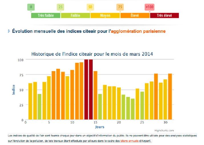 2014年3月のパリの大気汚染のグラフ。さまざまな対策を講じたにもかかわらず、基準値が5段階で最悪の日を2日連続で記録した。この経緯が2020年までに市内へのディーゼル車の乗り入れ禁止につながっている