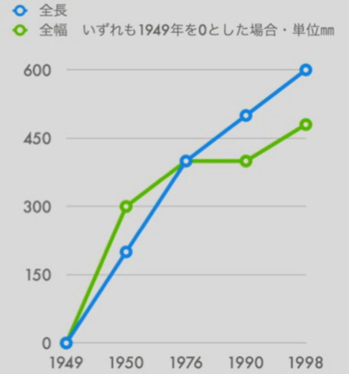 軽自動車のサイズの推移。1950年当時規格では、全長3000mm、全幅1300だったは、現在では全長3400mm、全幅1480mmまで大きくなった