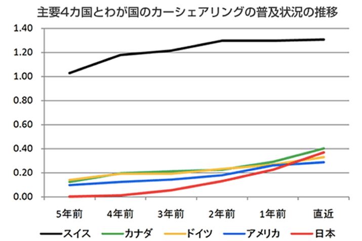カーシェアリングの先進国であるスイス(黒い線)だが、赤い線の日本も現在急激な勢いで普及しており、米国やドイツを抜いた(「公益財団法人交通エコロジー・モビリティ財団」からの出典)