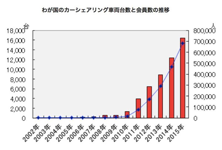 公益財団法人交通エコロジー・モビリティ財団によると、我が国におけるカーシェアリングは、2009年以前は皆無に近い存在だったが、2010年以降車両台数、会員数ともに順当に増加しており、2015年には1.6万台/70万人レベルにまでなっている。人口あたりの会員数で見ても、日本は老舗に相当するスイスには遠く及ばないものの、昨年は米国やドイツを上回ってさえいる。