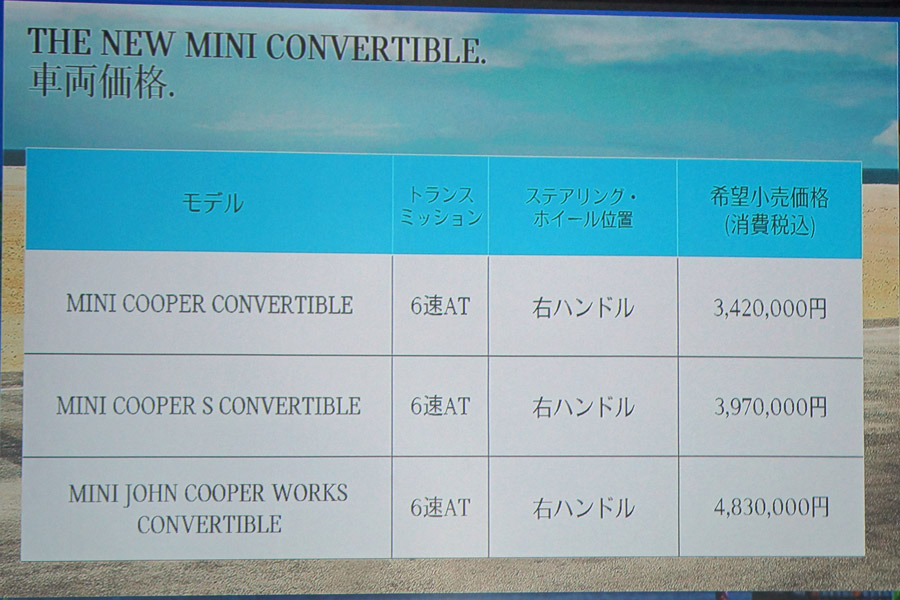 車両価格はMINI Cooper コンバーチブルが342万円、MINI Cooper S コンバーチブルが397万円、MINI John Cooper Works コンバーチブルは483万円