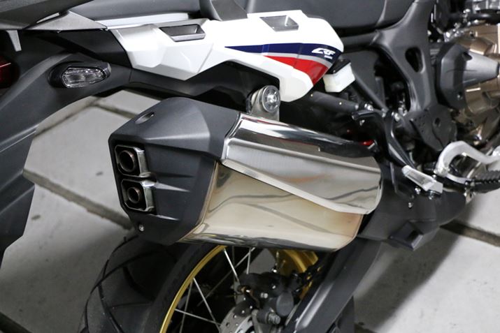 出口が2穴タイプのマフラーは大排気量らしい容量の大きなもの。大排気量車ならではの低く、迫力を感じる排気音だが、音量自体は静かだ