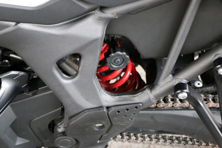 リアサスペンションもフロントと同様にフルアジャスタブルとなっている。プリロードなどは、ダイヤルで簡単に調整可能