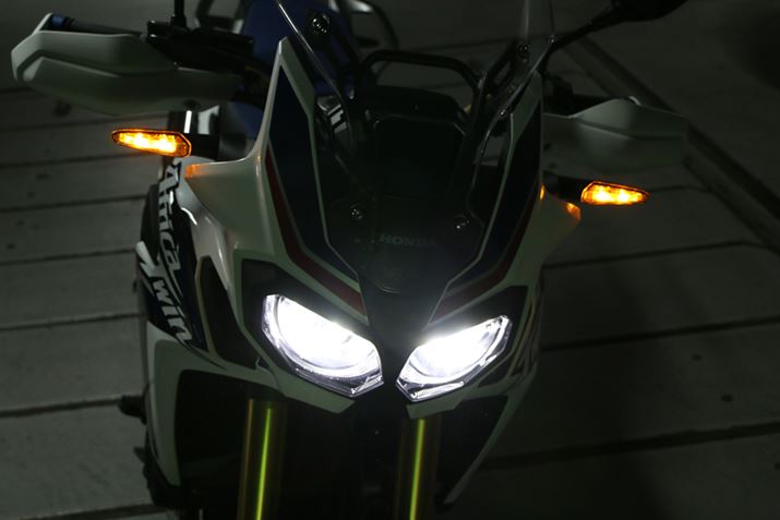 ライトはXRV750と同様の2灯式で、イメージを継承。XRV750は丸型だったがCRF1000Lでは現代的なツリ目デザインとなり、光源もLEDとなっている