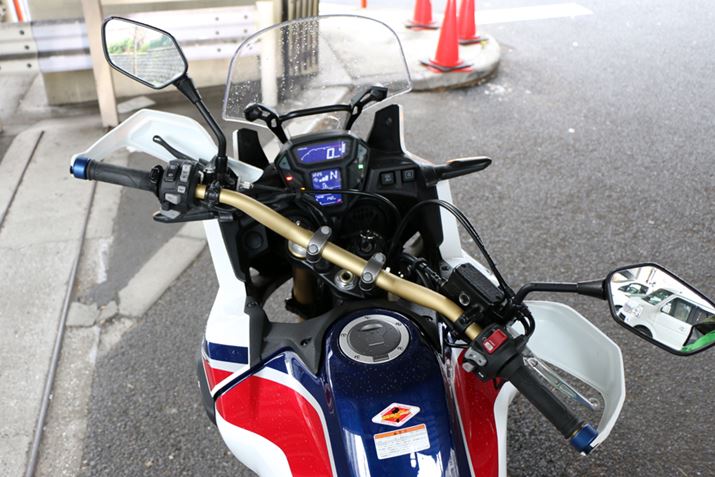 前モデル(XRV750)では40°だったハンドルの切れ角は、左右それぞれ43°になった。最小回転半径はクラストップレベルの2.6mとなっており、オフロード走行時や日常の押し歩きなどでも取り回しがしやすい