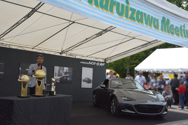 レースが終わると、人がステージ前に集まりだした。狙いは、「MX-5 RF」の日本初披露のアンヴェールだ。「MX-5 RF」は3月のニューヨークショーでワールドプレミアされたばかりのプロトタイプ。もちろん日本ではメディアの前にも出ていない。日本においては正真正銘の初披露となる。つまり、マツダはメディアよりも先にファンにクルマを見せようというのだ。ちなみに、軽井沢ミーティングでロードスターが日本初披露となるのは、今回が初ではない。先代の「NCロードスター」も最新の「NDロードスター」のシャシーの日本初披露も、軽井沢ミーティングの会場が使われている。ここからもマツダが軽井沢ミーティングを非常に大切に思っていることがうかがい知れる。