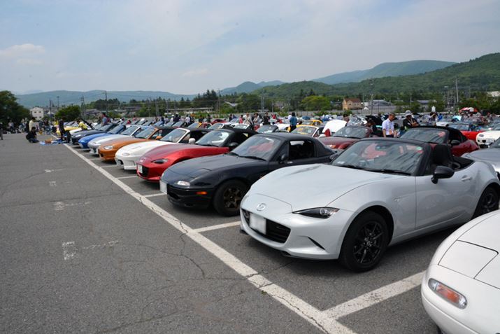 一面がロードスターのメイン会場の駐車場。周辺の駐車場不足のため電車で参加する人が100名以上いたという