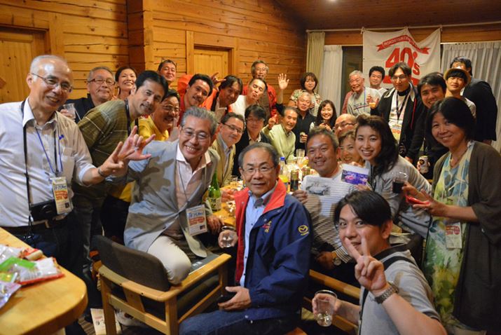 コテージは中央のリビングを挟んで4部屋8ベッド。同宿は、神奈川からやってきた子供連れ3人の夫婦が2組。そして、僕のような単身で参加する男性3名だ。うち2人は顔見知りであるが、ほかは初めてであった。少し話をした後に二次会へ。実は、ウェルカムパーティーの後はコテージごとに飲んだりするのだが、例年、どこか1か所のコテージに集まって大きな二次会が開かれる。カメラを持って覗いてみれば、いたいた! 実行委員会の面々にまじって、元開発責任者の貴島さんや元デザイン本部長の福田さん、現在の広報本部長の工藤さんも。さらに遅れて現在の開発責任者の山本さんもやってきた。僕と同じように前泊から参加しているメディアの人間も隣に。まさに無礼講のように、マツダの開発陣とファンがクルマ談義に盛り上がる。これが前泊の最大の楽しみだったりするのだ。
