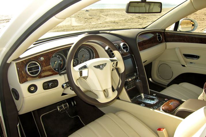 ベントレー「フライングスパー」の運転席。淡色のレザーをメインに、濃色のレザーをサブに、ウッドパネルをアクセントとして取り入れている