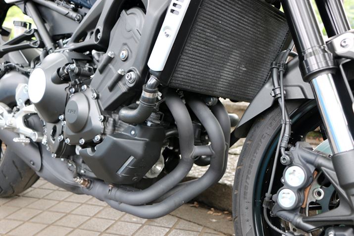 XSR900の魅力を作り出す最大のポイントは、“クロスプレーン・コンセプト”にもとづく3気筒エンジンだろう。クロスプレーンとは、本来4気筒エンジンの4つの燃焼室を不等間隔で爆発させる構造とした時のクランク(ピストンの動きを円運動に変換するパーツ)の形状に由来する名称で、トラクション(エンジンの駆動力を路面に伝える能力)にすぐれることからレーシングマシンに採用されていた技術。そのトラクションのよさを3気筒で再現したのが、XSR900に搭載されているエンジンだ。このエンジンを含め、フレームや足回りなどの基本構造は、2014年に発売され今もなお高い人気を誇るスポーツマルチバイク「MT-09」と共通。ほかにも、スイッチでエンジン特性を切り替えできる「D-MODE」(走行モード切替システム)といったMT-09の精良な部分を受け継いでいる。