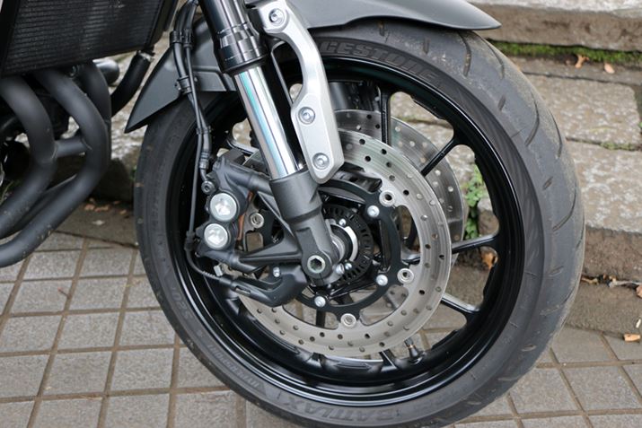 ダブルディスクのフロントブレーキには、ラジアルマウントキャリパーを採用。ABSも装備されている。タイヤサイズは120/70の17インチ